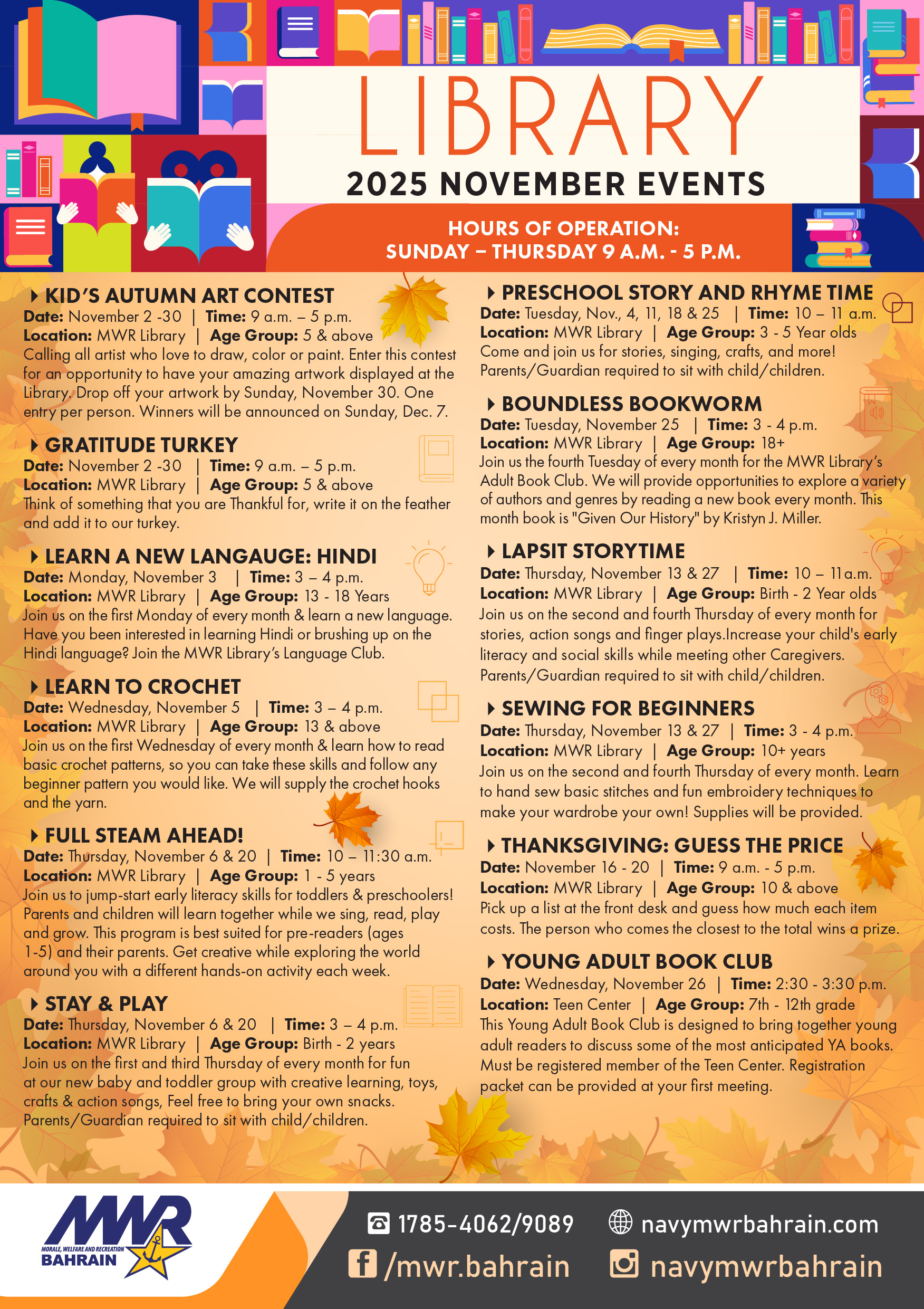 Date: Nov. 2 - 30, Time: 9 a.m. - 5 p.m., Location: MWR Library