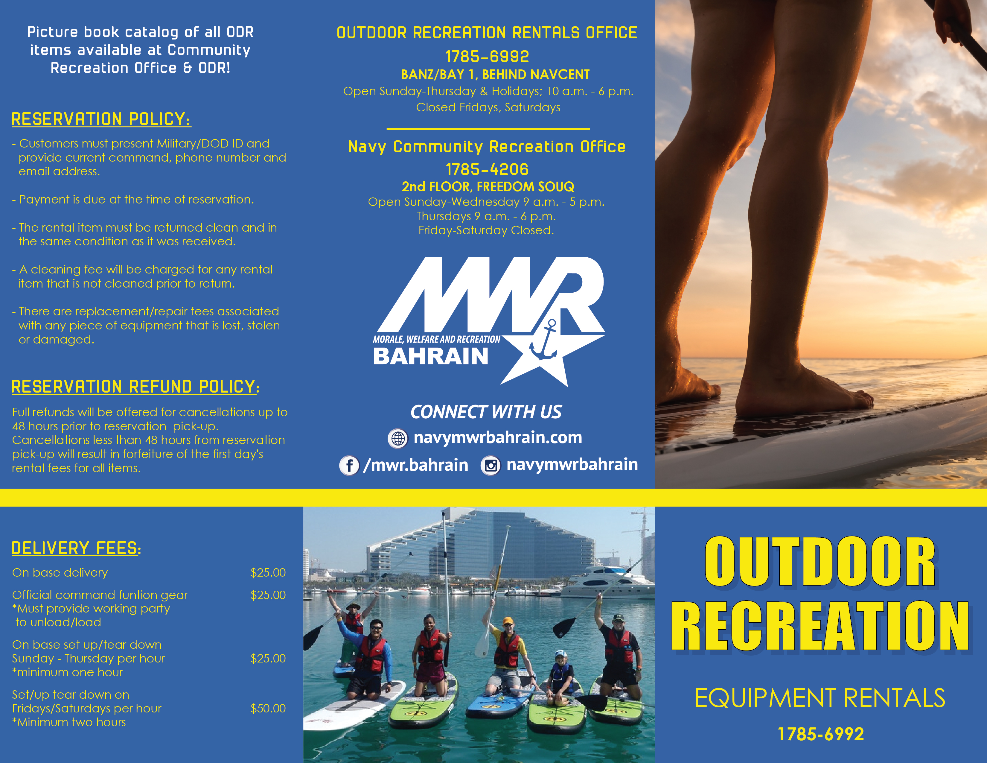 There is a myriad of recreational, sporting and leisure equipment and gear available for checkout. Check out items are subject to a nominal fee. Inquire, reserve and pay for your recreation rentals at the Community Recreation Office in the Freedom Souq or at ODR in BANZ BAY 1