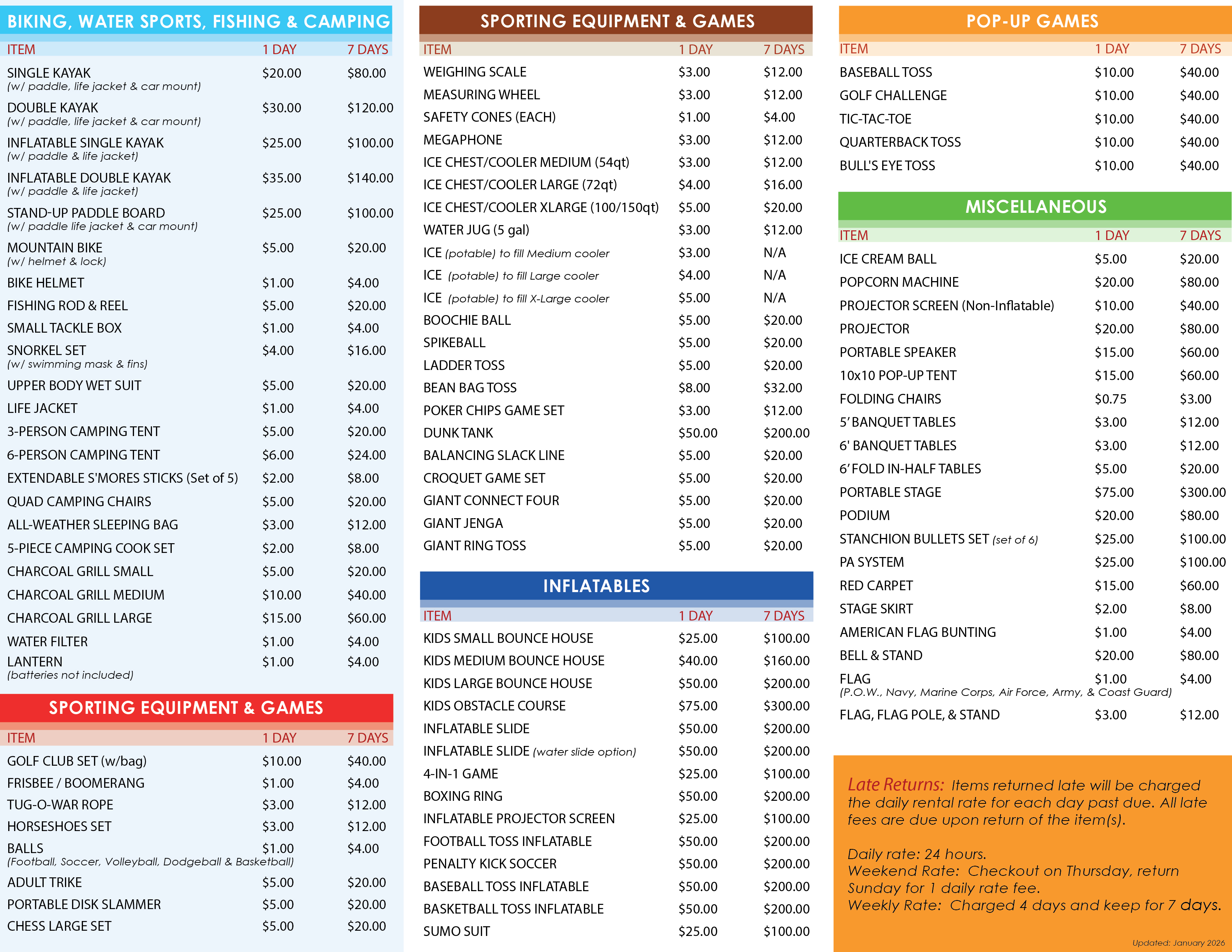 -Fees will be charged for each day equipment is in customer’s possession (unless weekly/weekend rate is applied)