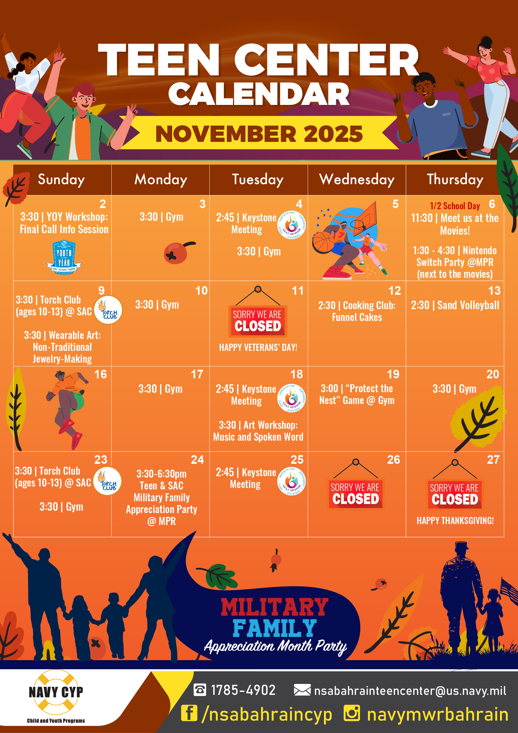 Our teen center is open to eligible family members in grades 7-12 of active duty, retirees, DoW civilians, and DoW contractors. After becoming a member of our open recreation program, kids can participate in the teen program activities. We have several clubs and activities that the teens can choose to be involved in including Keystone, STEAM club, Money Matters, Power Hour, Passport to Manhood, Robotics and much more. We also have our Marhaba Club that helps to welcome new Youth to the community. On several of the no school days, we take the youth out in town on trips to places like Lost Paradise Water Park, City Centre Mall, and area parks. We also have lots of cool events for teens right here at our center, like talent shows, cooking activities, late nights, and holiday parties.