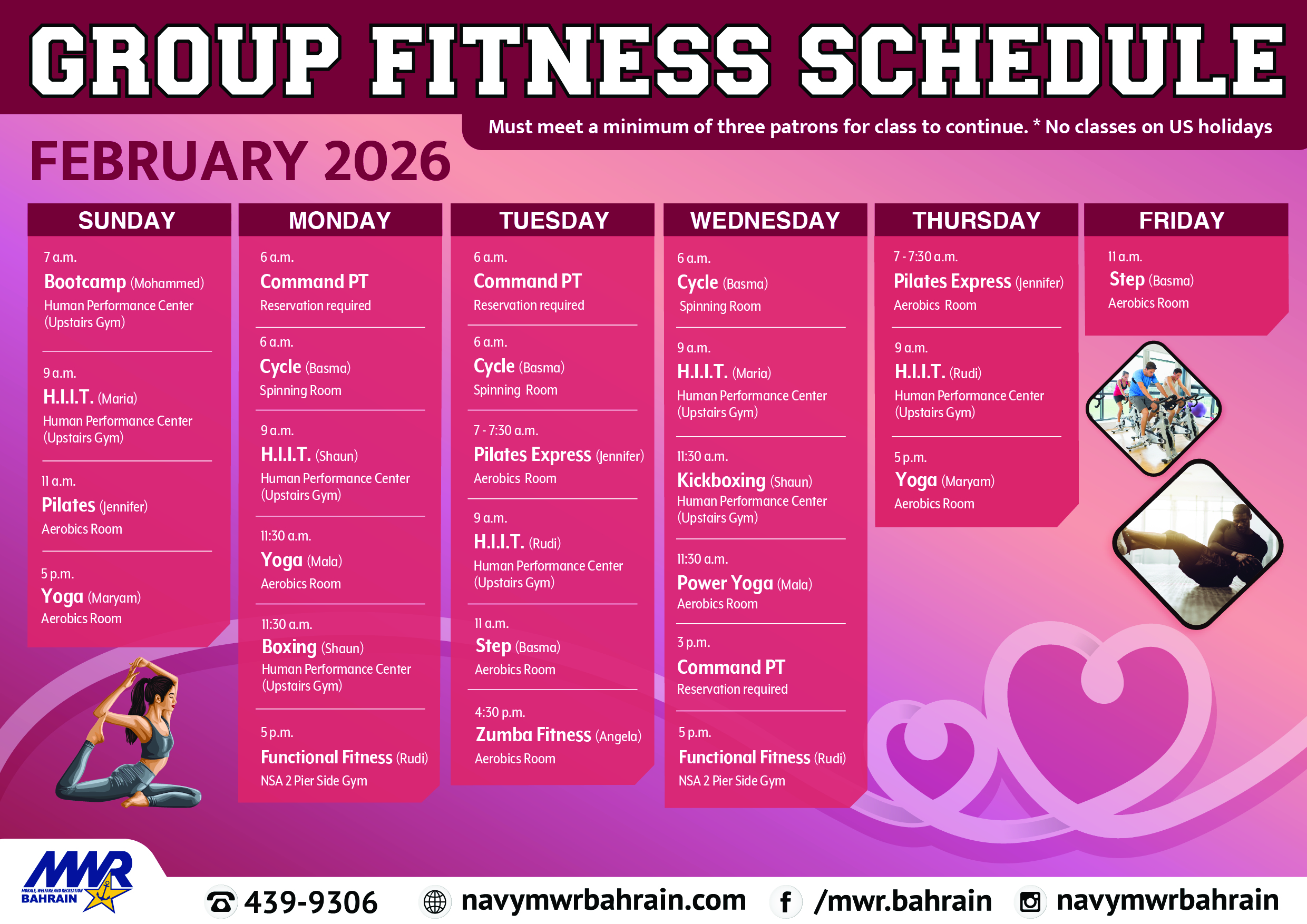 Appointment is required at the fitness center front desk. Exercise format is facilitated by our MWR fitness specialist and team of group class instructors. A class format choice of interval training, speed agility & quickness, yoga, get strong & burn and cycle.